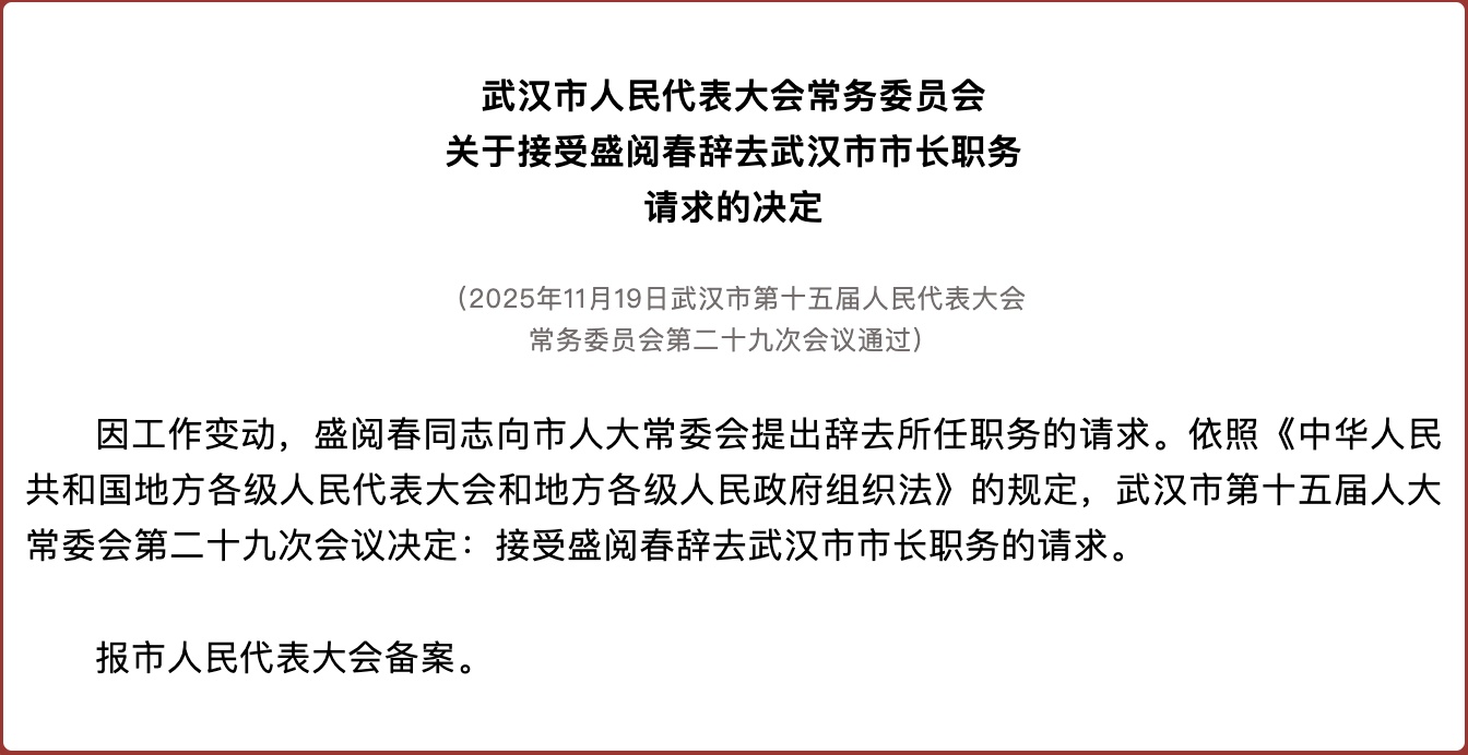 湖北日报讯(汤薇薇通讯员王晓山)武汉市第十五届人民代表大会常务委员会第二十九次会议11月19日召开,武汉市人大常委会主任胡立山主持会议。为了换工作,盛跃春同志向市人大常委会提交了辞呈。会议决定,根据《中华人民共和国地方各级人民代表大会和地方各级人民政府组织法》的规定,接受盛跃春辞去武汉市市长职务的请求。会上,武汉市委常委、组织部部长杨凌就人事变动和裁员情况进行了说明。会议审议了武汉市人民政府提出的人事任免方案。由于V会议决定,任命张飞为武汉市副市长。向受任命者颁发了任命书,并举行了宪法宣誓仪式。会议还审议了武汉市中级人民法院、武汉市人民检察院提交的任免方案,并决议批准相关任免名单。会议听取了武汉市人民政府关于依据2025法建设政府的报告。报告显示,今年以来,武汉市政府深入学习贯彻习近平法治思想和习近平总书记考察湖北重要讲话精神,全面落实党中央、国务院《全面建设法治政府实施纲要》。 (2021-2025年)》和省工作安排市委、市委深入推进法治政府建设,以高水平法治引领高质量发展。武汉被评为法治政府建设优秀城市,并成功启动国家法治政府建设示范工程。 《中国传统戏曲保护继承条例(第二稿)》并审议该条例(第三稿)。武汉市人大常委会副委员长陈光柱、朱令成、林文文、杨向伟、张海涛秘书长出席会议。武汉市副市长董玉华、市中级人民法院院长刘太平、市检察长彭胜坤出席会议。市法院 人民检察院、市监察委员会主任出席会议。